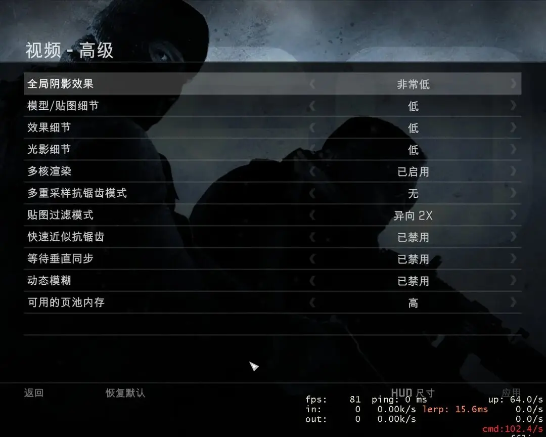由于是老显卡,在1280×1024的情况下,fps一直维持在三四五十之间,可玩,但是对于CS这种需要灵敏反应的游戏来说,还是很不够的。而且,这是在把所有特效全关的情况下。