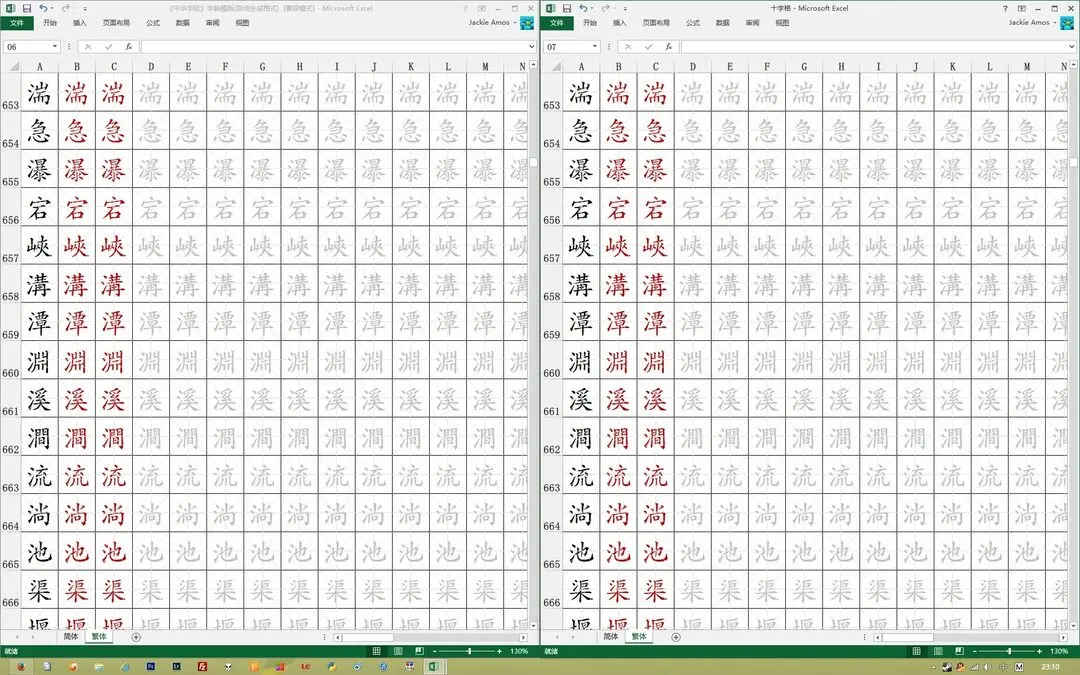 一开始制表时,受购买的字帖样本限制,使用的是十字格的样式。由于excel中只能依靠画线来解决十字问题,所以文档中包含着几千条横线、竖线,如果电脑稍微慢点,打开和修改该excel文件,会非常卡。而且由于电脑速度较慢(intel I7处理器,实在没辙了),excel一直假死而没能生成可以兼容03版的excel的xls文件,十字格的版本,需要wps或者07版以上的excel才能打开。如果处理器差点,打开十字格的文件可能要两三分钟,慢慢等就行了。