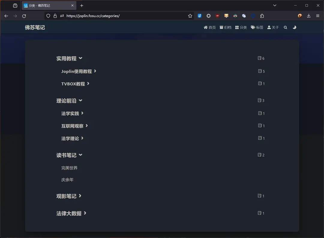此部分不是必须步骤 你可以依托自己在 Joplin 中的笔记本设置不作任何更改,Joplin Publisher 插件将自动提取带有 blog 标签的文章所在笔记本目录并作为博客目录发布。当然你也可以像我一样在 Joplin 中单独创建几个用于发布到博客的笔记本。例如上图,我创建了 5 个中文标题的笔记本,并在其中两个笔记本下继续创建了多个笔记本。在提交到博客后的显示结果如下: