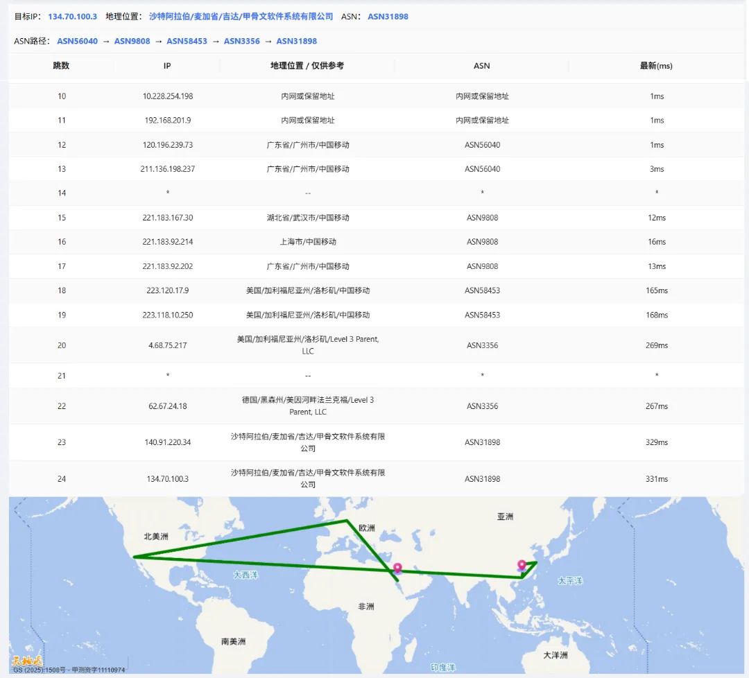 For instance, I randomly tested a line from China Mobile Guangzhou to Oracle’s Jeddah Data Center in Saudi Arabia, and it can be seen that the default route goes around North America and Europe, without passing through the Indian Ocean at all.