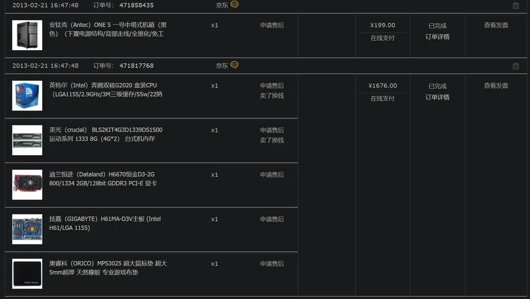 In 2013, I assembled another DIY computer. The components for this computer were all purchased from JD.com, so I can still find the configuration records.
